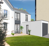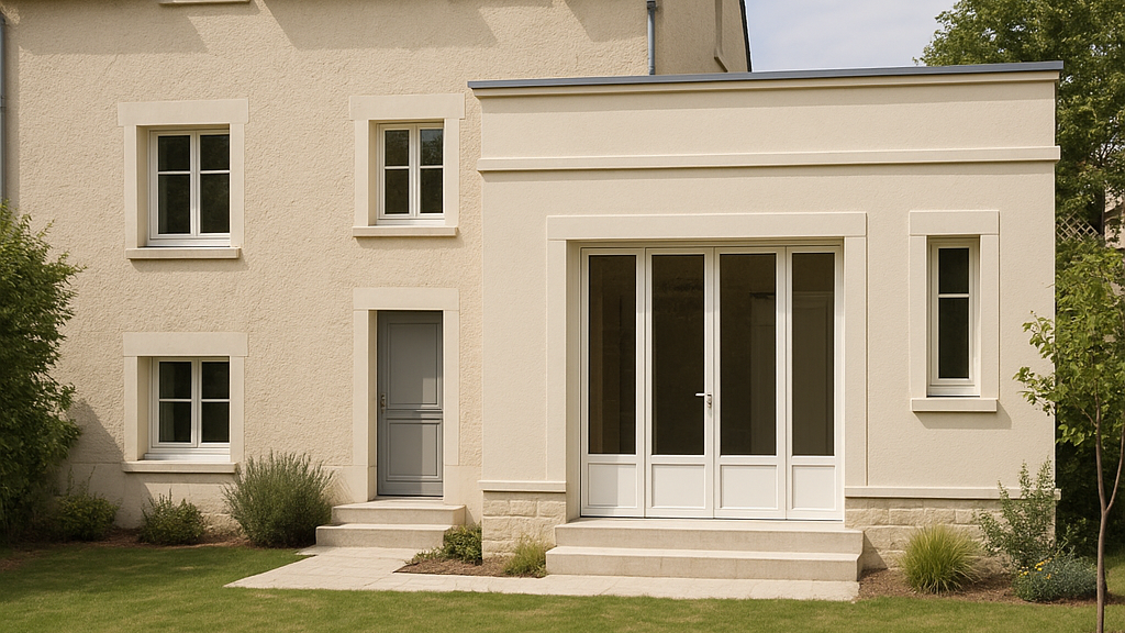 À Meudon, nos artisans ont récemment réalisé une extension moderne de maison avec façade en enduit clair, toiture plate et menuiseries aluminium noires.